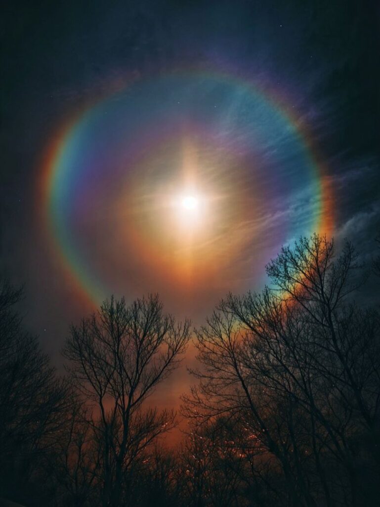 A lunar halo forms when icy hexagonal crystals high in the atmosphere bend moonlight into a perfect 22-degree ring ❄️. At the same moment, a vertical moon pillar appeared — light bouncing off countless drifting crystals, sending a silver beam straight toward the harbor 🌌.
