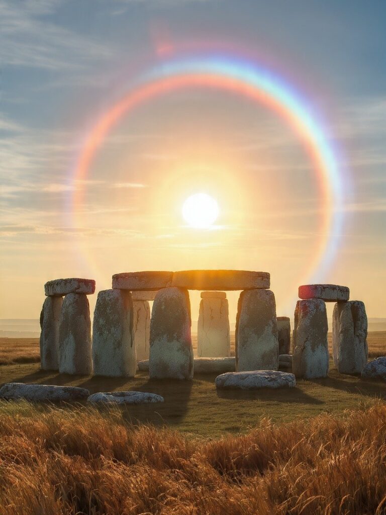 A perfect solar halo forming directly above the ancient stones — and people are calling it one of the clearest and most surreal rings ever captured.