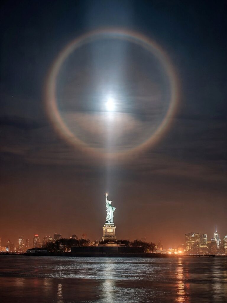 For over a century, the Statue of Liberty has lifted her torch as a promise of hope and freedom 🔥. Tonight the heavens seemed to honor that gesture… wrapping her in a circle of light and tracing a glowing path of moonbeam right to her torch — as if the night sky itself reached down to meet her ✨☁️🌕.