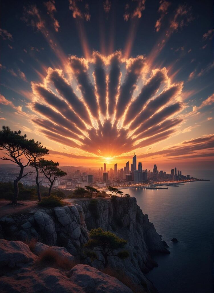 A rare “fan-burst cloud pattern” formed right as the sun dropped behind the horizon — creating this unreal, shell-shaped display that lit up the entire coastline. Moments like this don’t just look beautiful… they feel otherworldly.