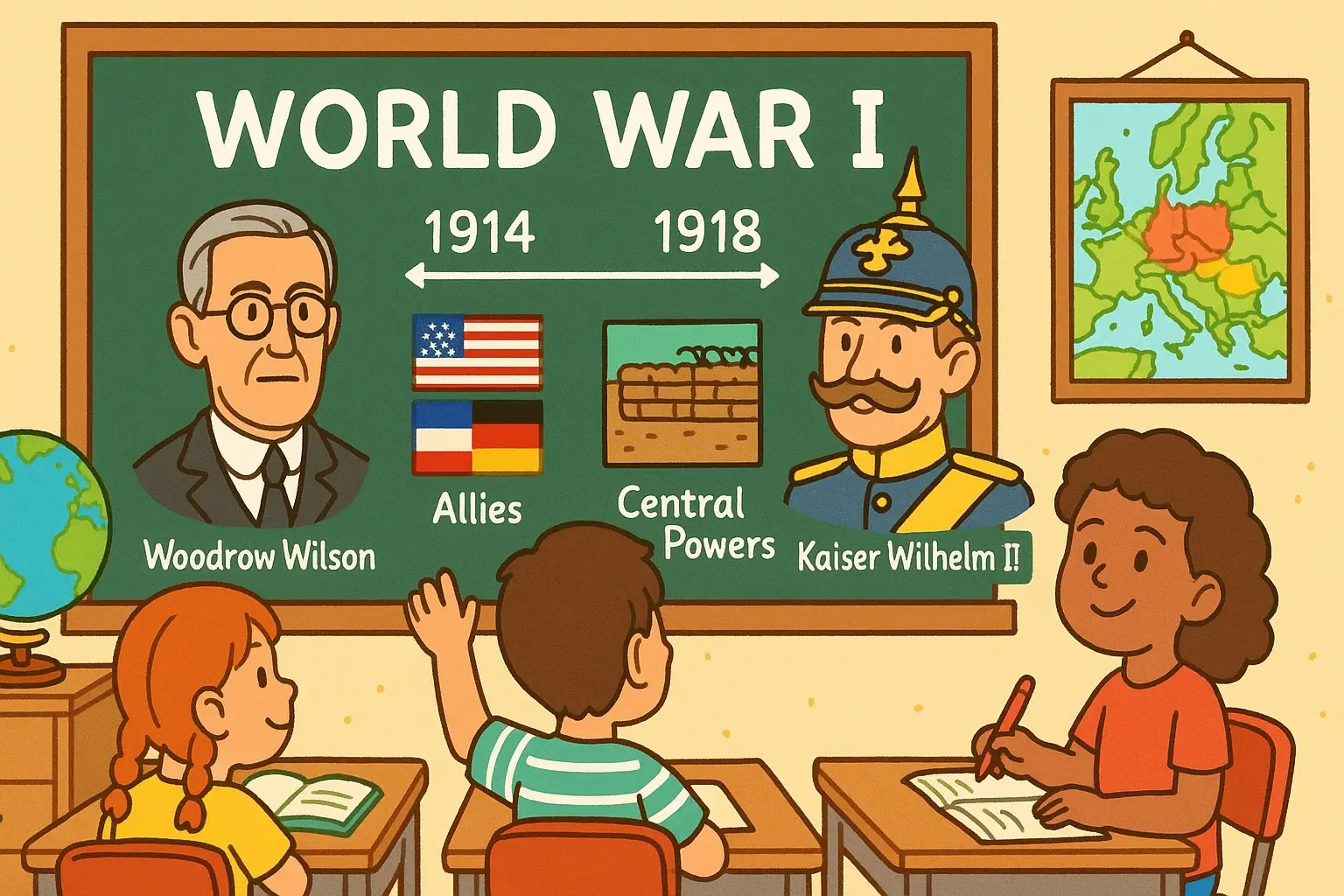 World War I, also called The Great War, was one of the largest wars in history. It lasted from 1914 to 1918 and involved many countries around the